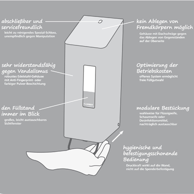 Langjährig ausgereiftes Produktdesign und durchdachte konstruktive Details ermöglichen Waschraumbesuchern die unkomplizierte, selbsterklärende Gerätebenutzung und erleichtern Servicekräften die Befüllung und Unterhaltsreinigung.