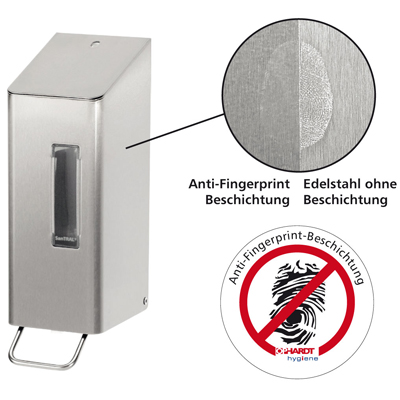 Im Gegensatz zu Beschichtungen auf Nano-Basis ist die SanTRAL® AFP-Ausstattung dauerhaft widerstandsfähig gegen handelsübliche Reiniger. So werden sichtbare Fingerabdrücke dauerhaft wirksam reduziert. Auf den Besucher des Waschraums wirken AFP-ausgerüstete SanTRAL® Spender stets sauber und hygienisch – und motivieren so zur Händehygiene.