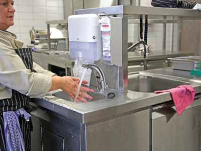 Gründliches und regelmäßiges Händewaschen zwischen allen Arbeitsgängen mit Seife und warmem Wasser und das anschließende Abtrocknen mit Einweghandtüchern beugt einer Übertragung von Mikroorganismen auf Lebensmittel entscheidend vor. Dabei sollten die Hände an dem in jeder Küche dafür vorgesehenen Handwaschbecken gewaschen werden und nicht am gleichen Becken, in dem auch Lebensmittel oder Geschirr gereinigt werden. Nach Arbeiten mit rohen Lebensmitteln, insbesondere Fleisch, Geflügel und Eiern, sowie nach jedem Toilettenbesuch müssen die Hände nach dem Waschen zusätzlich desinfiziert werden.