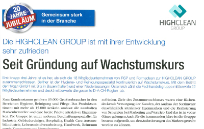 Erst knapp drei Jahre ist es her, als sich die 18 Mitgliedsunternehmen von RSP und Formaclean zur HIGHCLEAN GROUP zusammenschlossen. Seither ist der Hygiene- und Reinigungsspezialist kontinuierlich auf Wachstumskurs. Mit dem Beitritt der Hygan GmbH mit Sitz in Bozen (Ital ien) und einer Niederlassung in Österreich zählt die Fachhandelsgruppe mittlerweile 22 Mitgliedsunternehmen und deckt mittlerweile die gesamte D-A-CH-Region ab.