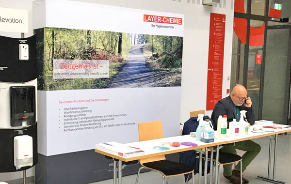 Layer-Chemie hat sich im Atrium des SpOrt Stuttgart mit einem Präsentationsstand vorgestellt. Unter dem Motto “Sie erhalten Produkte und Dienstleistungen” wurden die folgenden Aspekte thematisiert: