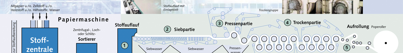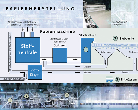 Die größten Papiermaschinen, die heute im Einsatz sind, können eine Breite von über zehn Metern und eine Länge bis zu 120 Metern haben. Pro Minute produzieren sie bis zu 1.400 Meter Papier. Nur wenige Sekunden dauert es vom ersten Auftreffen der Faserstoff-Wasser-Suspension auf dem Sieb bis zum fertigen Papier. Im Verhältnis 1:100 mit Wasser verdünnt, werden die Faserstoffe zusammen mit Hilfsstoffen auf die Papiermaschine aufgebracht. Die Fasern lagern sich auf dem Sieb neben- und aufeinander ab. Das Wasser läuft ab oder wird abgesaugt. Auf diese Weise entsteht ein gleichmäßiger Faserverbund, der durch mechanischen Druck und mit Hilfe von Dampfwärme weiter entwässert wird. Am Ende wird die Papierbahn auf einen Stahlkern (Tambour) aufgerollt. Der gesamte Verfahrensablauf unterteilt sich dabei im Wesentlichen in die Bereiche Stoffaufbereitung, Papiermaschine, Veredelung und Ausrüstung.