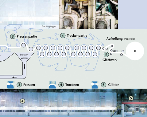 Das verbliebene Restwasser wird in der Trockenpartie aus dem Papier verdampft. Slalomartig durchläuft die Papierbahn mehrere dampfbeheizte Trockenzylinder. Das Rohpapier kann gleichmäßig trocknen. Am Ende hat das Papier eine Restfeuchte von wenigen Prozenten. Der entstandene Wasserdampf wird aus der geschlossenen Trockenhaube abgesaugt und in eine Wärmerückgewinnungsanlage geführt. Ein Teil der Papiermaschinen besitzt im Anschluss an die Trockenpartie ein Glättwerk, das aus mehreren übereinander angeordneten Walzen besteht, die der Papierbahn eine glatte Oberfläche und gleichmäßige Blattdicke geben. Hier werden außerdem mit hochsensiblen Messdetektoren die wichtigsten Papierqualitätswerte online erfasst und per Computer der automatischen Regelung der Maschinenstellwerke zugeführt.