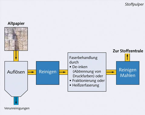Altpapier wird in zahlreichen Qualitätsstufen gesammelt und für viele Papiersorten eingesetzt. Bevor Altpapier für die Produktion von neuem Papier eingesetzt werden kann, ist eine Reihe von Aufbereitungsschritten notwendig: Das Altpapier wird zunächst in Wasser aufgelöst und zerfasert. Dazu dient der Stofflöser oder „Pulper“, dessen Wirkungsweise einem Küchenmixer ähnelt. In verschiedenen Schritten werden die Fasern von papierfremden Teilen, wie Büroklammern, Klebern und Kunststoffen gesäubert. Der Altpapierfaserbrei wird dazu über Siebe geführt und in Sortier-Aggregaten behandelt. Soll der Recyclingstoff später für die Herstellung von hochwertigen Druckpapieren eingesetzt werden, muss das Altpapier außerdem von der Druckfarbe befreit werden. Diesen Verfahrensschritt nennt man DeInking. Dabei werden die Druckfarben mit Wasser, Natronlauge und Seife von den Fasern gelöst. In das Wasser wird Luft eingeblasen. Die wasserabstoßenden Druckfarbenpartikel lagern sich mit der Seife an die Luftbläschen an, steigen an die Wasseroberfläche und können dort als Schaum abgesaugt werden.