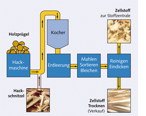Zellstoff zeichnet sich durch lange, feste Fasern aus. Sie sorgen dafür, dass das Papier stabil und reißfest ist. Zur Herstellung von Zellstoff wird Holz – meist als Hackschnitzel – in einem Kocher chemisch aufgeschlossen. Durch Druck und Erhitzen lösen sich Stoffe wie Harze und Lignine von den Holzfasern. Aus 100 kg trockener Holzsubstanz gewinnt man je nach Verfahren und Herstellungsbedingungen bis zu 50 kg Zellstoff. Je nach Verwendungszweck ist außerdem Bleichen erforderlich. Früher bleichte man mit elementarem Chlor, heute mit Sauerstoff, Wasserstoffperoxyd oder Chlorverbindungen. Während für die Herstellung von Holzschliff vorwiegend Fichten- und Tannenhölzer verwendet werden, sind zur Erzeugung von Zellstoff sowohl Nadel- als auch Laubhölzer geeignet. Zudem wird Zellstoff aus Einjahrespflanzen, wie Stroh, Zuckerrohr und Alfagras hergestellt. Zellstoff wird überwiegend aus Skandinavien und Kanada importiert.