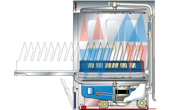 Ein weiteres Konstruktionsmerkmal der neuen Geschirrspülautomatengeneration ist der Einsatz einer Abluftwärmerückgewinungsanlage. In dieser Einrichtung wird das zulaufende kalte Frischwasser durch die warme Maschinenabluft bereits vorerwärmt. So wird beispielsweise das mit 10 °C zulaufende kalte Frischwasser kostenlos auf 45 °C vorerwärmt. Ohne eine Abluftwärmerückgewinnungsanlage müßten für diese Vorerwärmung ca. 15 kW eingesetzt werden. Für die anschließende Weitererwärmung auf 85 °C im Wassererwärmer ist ein um diesen Betrag geringerer Anschlusswert erforderlich (gleichzeitig wird als zweiter positiver Effekt der Abluftwärmerückgewinnungsanlage die Maschinenabluft entfeuchtet). Eine Verringerung des Energieeinsatzes wurde auch durch die Entwicklung einer MEIKO-Niedertemperaturtrocknung realisiert. Hierfür wird während des Betriebes kontinuierlich Luft aus der Trockenzone abgesaugt und von der Anlaufseite her die Trocknungsluft durch Beimischung von Frischluft kontinuierlich regeneriert. Dadurch wird die relative Feuchte sehr nieder gehalten und es genügt in Verbindung mit einer hohen Luftumwälzung eine niedrigere Trocknungstemperatur von 60 – 70 °C für ein optimales Trocknungsergebnis. Durch dieses Verfahren konnte der Energieeinsatz auch in der Trocknung um bis zu 50% reduziert werden.