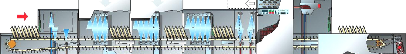 Am Beispiel der MEIKO-Bandtransportautomaten möchten wir Ihnen die verschiedenen Ansatzpunkte aufzeigen. Der entscheidende Verbrauch einer Spülmaschine ist die Frischwasserklarspülung. Dort muss aus hygienischen Gründen Wasser mit ca. 85 °C über das Geschirr gesprüht werden. Wo früher ca. 600 l Klarspülwasser pro Stunde nötig waren, sind heutzutage durch den Einsatz z.B. einer Pumpenklarspülung, die das Wasser der anschließenden Klarspülung wieder verwendet und damit doppelt nutzt, sowie des AWS-Systemes, das dieses bereits doppelt verwendete Wasser zusätzlich reinigt, nur noch 260 l Wasser pro Stunde erforderlich. Durch den mehr als halbierten Frischwasserverbrauch ergeben sich in gleichem Maße weitergehende Einsparungen.